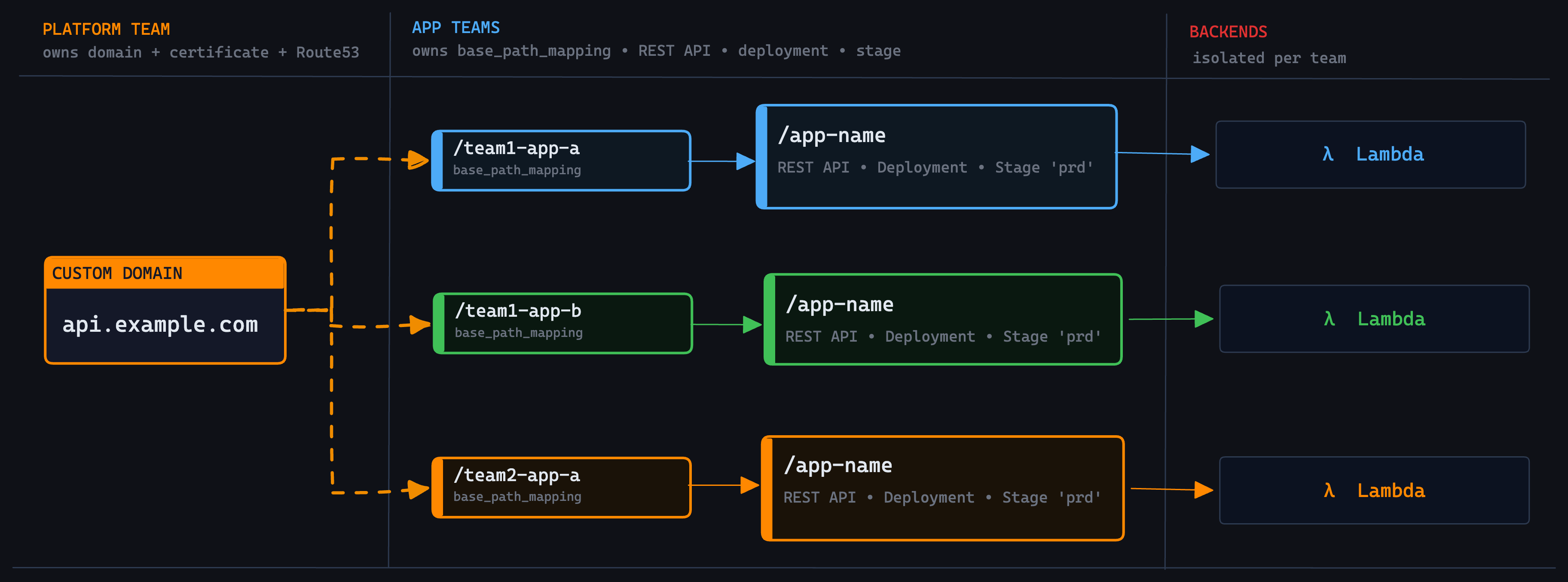 Each app team owns their own REST API, resources, methods, integrations, deployment, stage, and base path mapping. The only dependency on the platform team is var.api_domain.